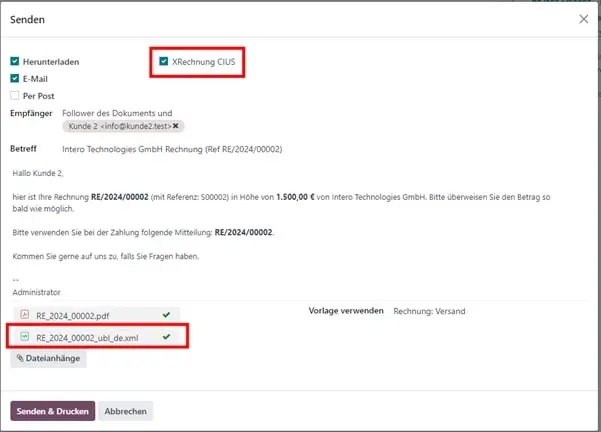 Wird nun in Odoo eine Rechnung erzeugt, bietet je nach Konfiguration des Kundenstammsatzes zur Rechnungsstellung das System beim Versand der Rechnung neben Standardformaten und -wegen nun auch die elektronische Rechnungsstellung an: