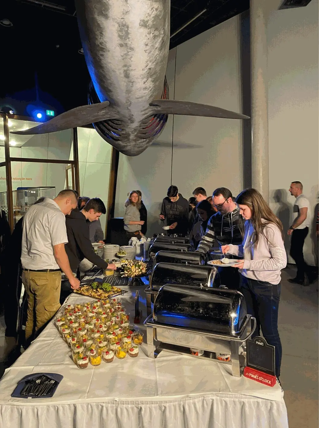 Zur Auswahl standen eine Vielfalt an Hauptgerichten sowie Nachspeisen. Hier konnten wir den restlichen Abend köstliche Speisen zu uns nehmen und uns, umgeben von Aquarien, austauschen.