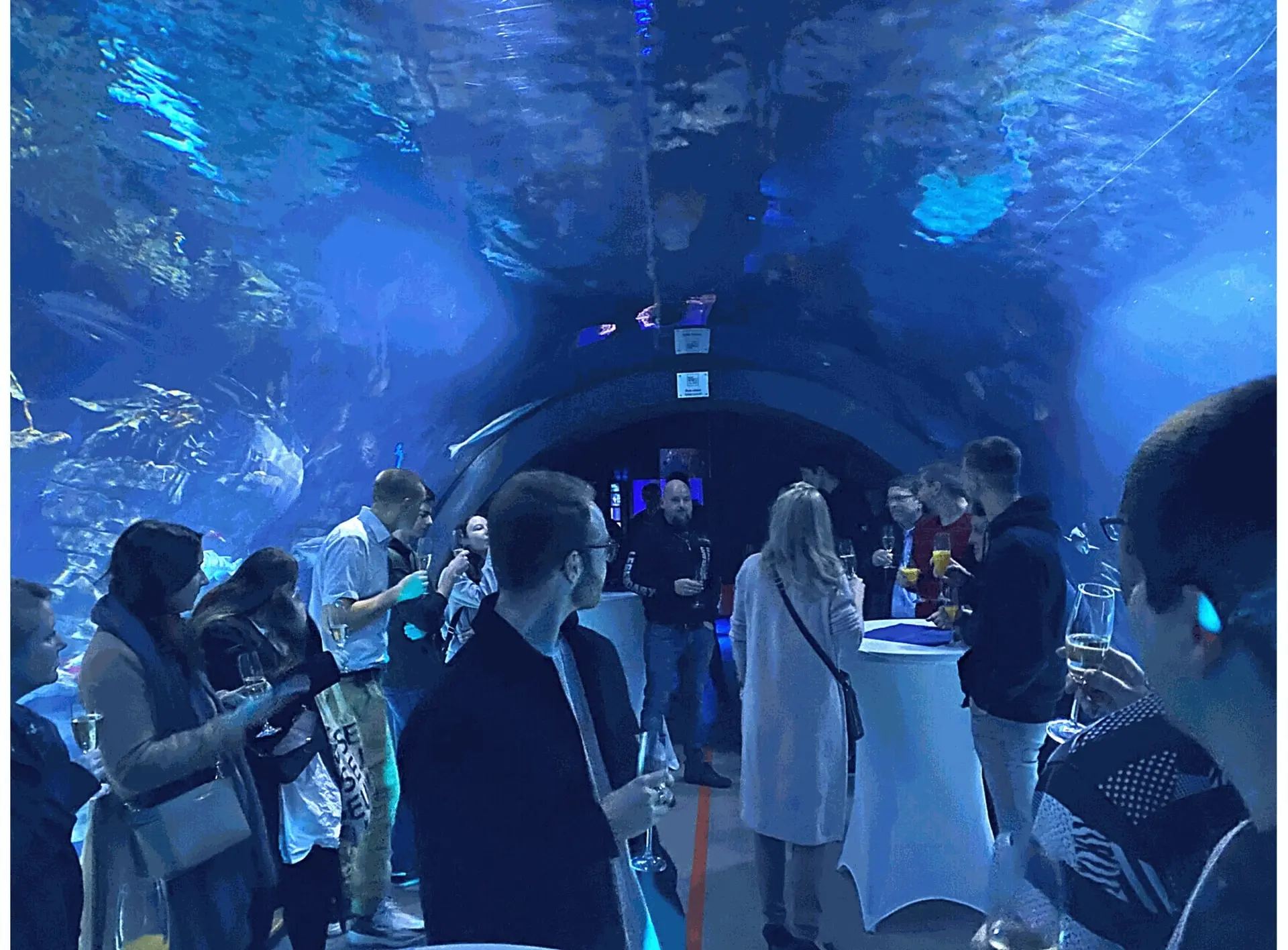 Der Abend begann um 18 Uhr mit einem Sektempfang im Tunnelaquarium. Bereits beim Sektempfang konnten wir uns von den Fischen, die über uns hinweg schwammen, verzaubern lassen. Gute Gespräche unter den Kollegen und die einzigartige Atmosphäre direkt neben den Meereslebewesen sorgten für eine gelöste Stimmung. An diesem Abend konnten sowohl langjährige als auch neue Mitarbeiter zusammen sitzen und sich besser kennenlernen.