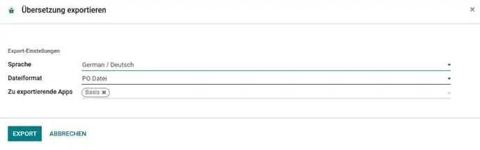 In der __manifest__.py muss in den dependencies immer das Modul aufgeführt werden, in welchem wir die Übersetzung vornehmen. In diesem Fall also „base“.