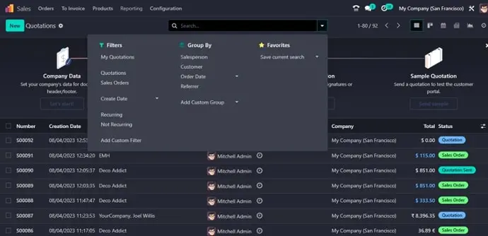 Suchansicht: Odoo 17 bietet den Nutzern eine optimierte und vereinfachte Suchfunktion. Dies wird durch den Ausbau von Filtern, Gruppierungsmöglichkeiten, Favoriten und Untermenüs erreicht.
