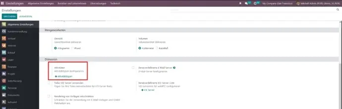 Zur Auswahl als Aktion gibt es in Odoo Standard die Folgenden: „Keine, Dokument hochladen, Anruf, Meeting und Steuerreport“.