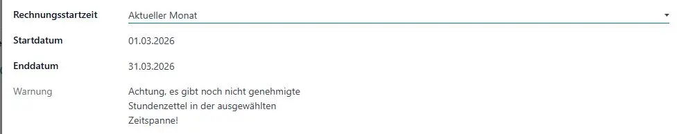 Das Modul prüft bei der Rechnungserstellung, ob die Zeiten der Dienstleistungsprodukte validiert wurden. Ist das nicht der Fall, erscheint eine deutliche Warnung – dennoch kann die Rechnung bei Bedarf „erzwungen“ werden. Zusätzlich kann in Odoo Buchhaltung in der Rechnungsansicht der Leistungszeitraum angezeigt werden, sodass die Zeiträume klar nachvollziehbar sind.